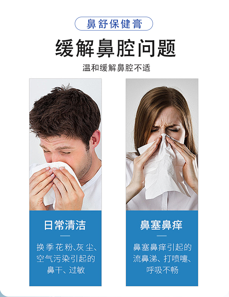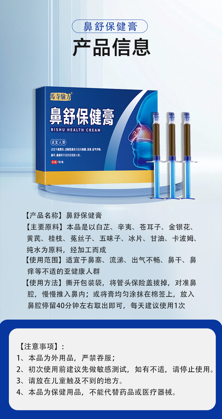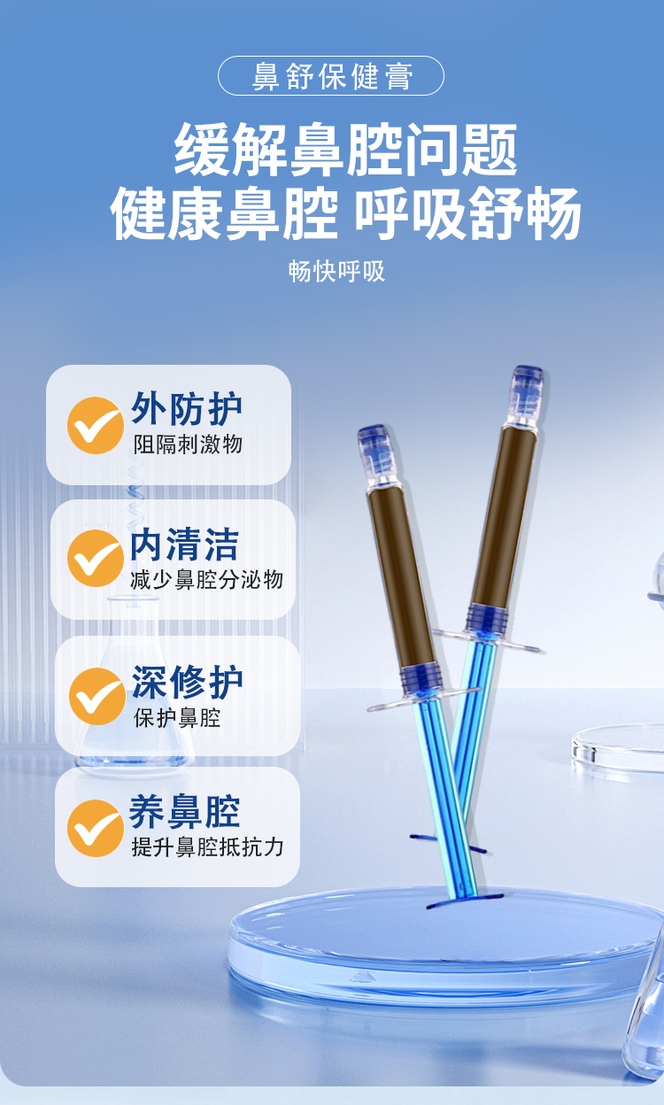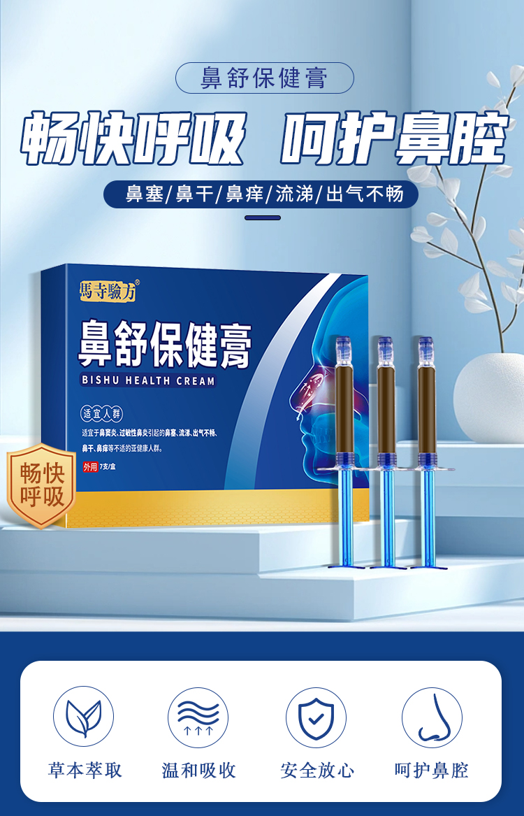 鼻舒保健膏,以草本成分為主的鼻腔護(hù)理產(chǎn)品,適用于鼻塞、鼻干、鼻癢、流涕、出氣不暢等鼻部不適,規(guī)格為7支/盒,將管頭保險(xiǎn)蓋拔掉,對(duì)準(zhǔn)鼻腔,慢慢推入鼻內(nèi),每天建議使用1次,源頭廠家,多樣化oem貼牌代加工。